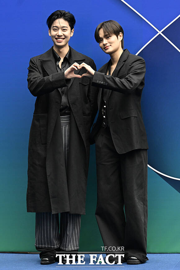 그룹 드리핀의 김동윤(왼쪽)과 이협이 4일 오후 서울 중구 동대문디자인플라자(DDP)에서 열린 2026 F/W 서울패션위크 곽현주컬렉션 포토월에 참석해 포즈를 취하고 있다.