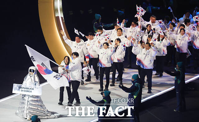 [동계올림픽] 깃발 든 차준환-박지우...'팀 코리아' 밀라노 올림픽 개회식 입장