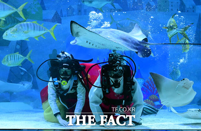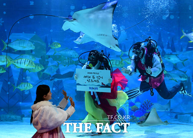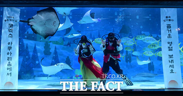 [더팩트ㅣ이새롬 기자] 설 연휴를 앞둔 10일 서울 강남구 씨라이프 코엑스 아쿠아리움에서 설 맞이 수중 공연이 열린 가운데, 한복 차림의 아쿠아리스트들이 설 인사를 하고 있다.
