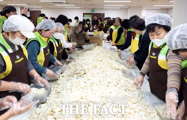 [더팩트ㅣ대전=선치영 기자] 대전시 서구는 11일 구청 지하 다목적실에서 자원봉사협의회와 함께 어려운 이웃을 위한 설맞이 '사랑의 떡국떡 나눔 행사'를 진행했다.