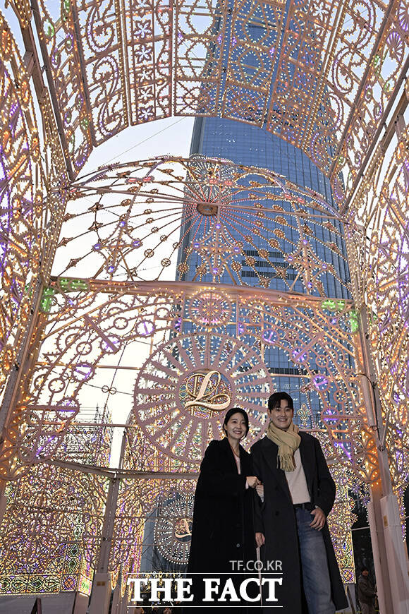 올해 2회를 맞은 '2026 롯데 루미나리에 Wish Shines on'은 17m 높이의 돔을 중심으로 펼쳐진 가로 63m, 세로 25m 규모의 십자형 터널이 특징이다.