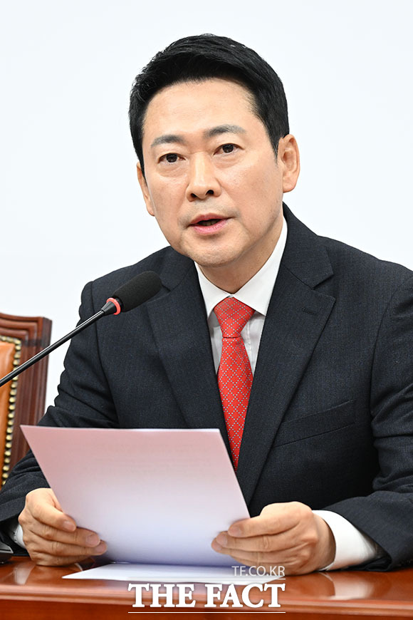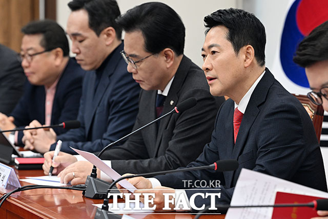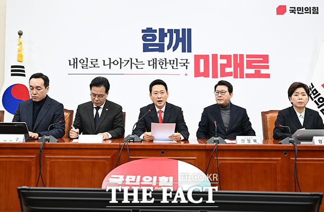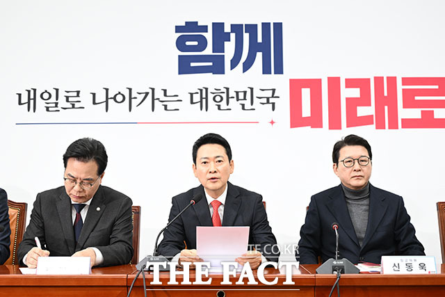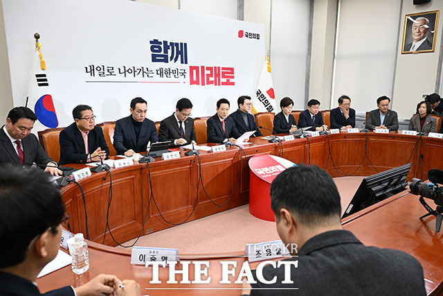 [더팩트ㅣ국회=남용희 기자] 장동혁 국민의힘 대표(가운데)가 12일 오전 서울 여의도 국회에서 열린 최고위원회의에서 발언을 하고 있다.