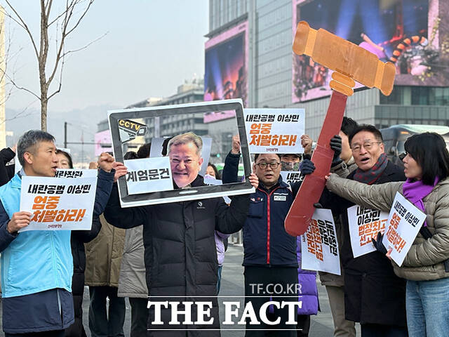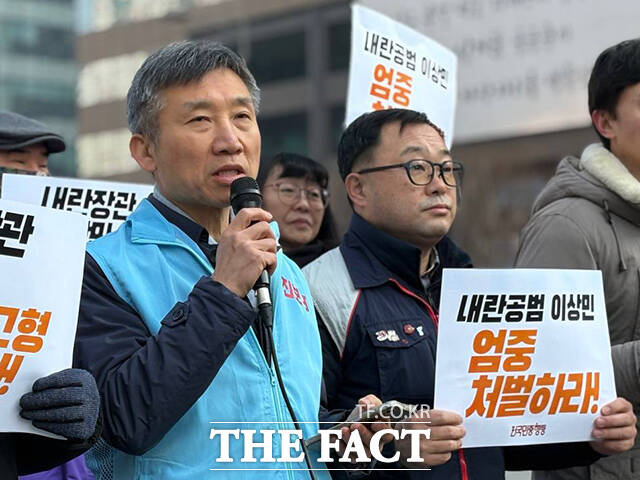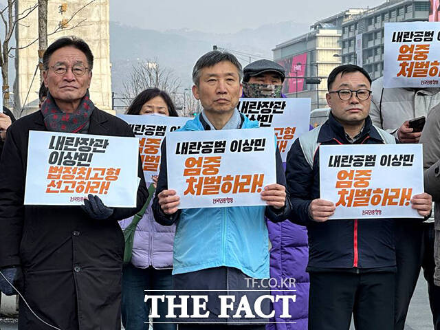 [더팩트 | 김성렬 인턴기자] 이상규 진보당 서울시장 후보와 전국민중행동이 12일 서울 종로구 광화문 이순신 동상 앞에서 기자회견을 열고 이상민 전 행정안전부 장관의 엄중 처벌을 촉구했다.