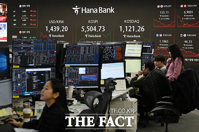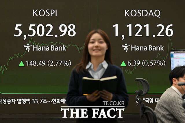[더팩트ㅣ서예원 기자] 코스피가 5500선을 넘긴 12일 오후 서울 중구 하나은행 본점 딜링룸 전광판에 지수가 표시되고 있다.