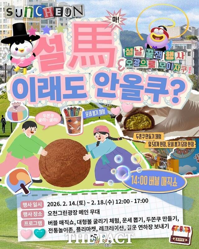 [더팩트ㅣ순천=고병채 기자] 전남 순천시는 설 연휴 기간 시민과 귀성객이 함께 즐길 수 있는 참여형 문화 프로그램을 오천그린광장에서 운영한다고 12일 밝혔다.