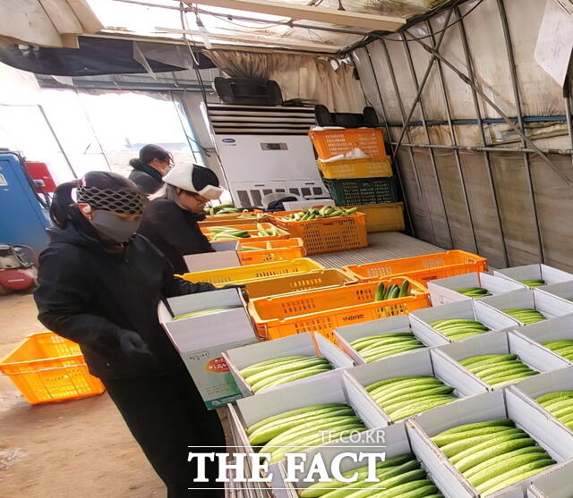 [더팩트ㅣ천안=정효기 기자] 충남 천안시가 한파 속에서도 굳건히 자란 '하늘그린오이'를 본격 출하한다고 13일 밝혔다.