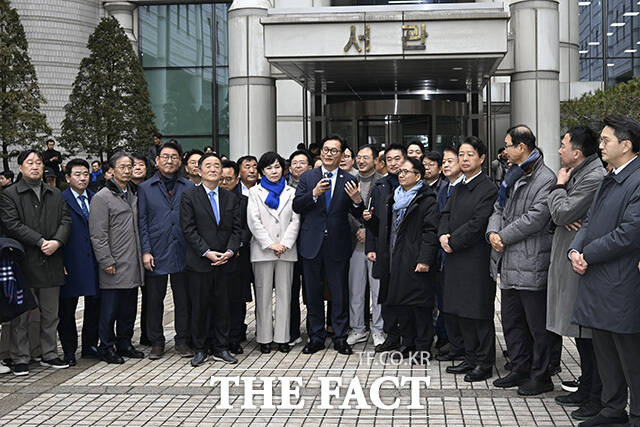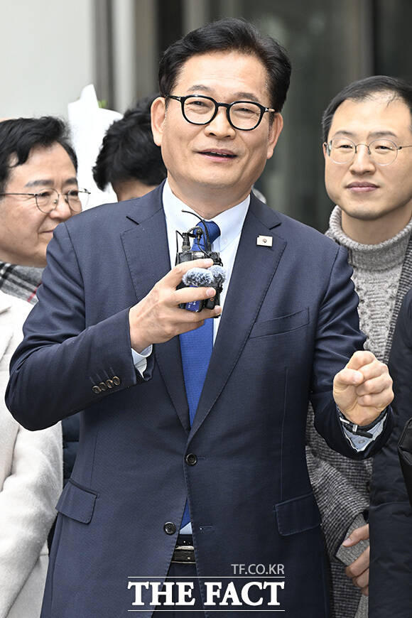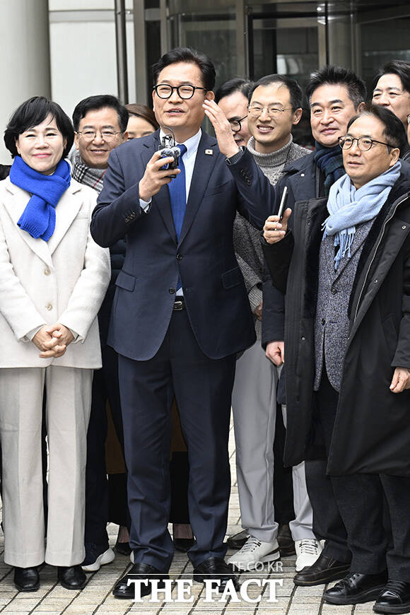 [더팩트 | 송호영 기자] 지난 2021년 더불어민주당 전당대회 관련 '돈봉투 살포' 의혹 등으로 재판을 받아온 송영길 소나무당 대표가 13일 오후 서울 서초구 서울고등법원에서 열린 항소심 선고공판에서 무죄를 선고받은 후 입장을 밝히고 있다.