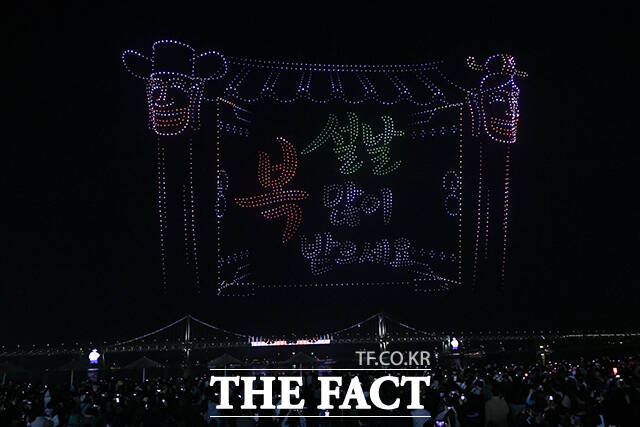 [더팩트 | 부산=박상민 인턴기자] 설 연휴 첫날인 14일 저녁 부산 수영구 광안리해수욕장에서 '광안리 M 드론라이트쇼' 특별 공연이 펼쳐지고 있다.