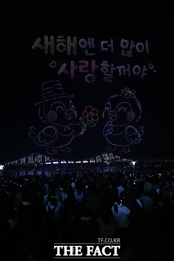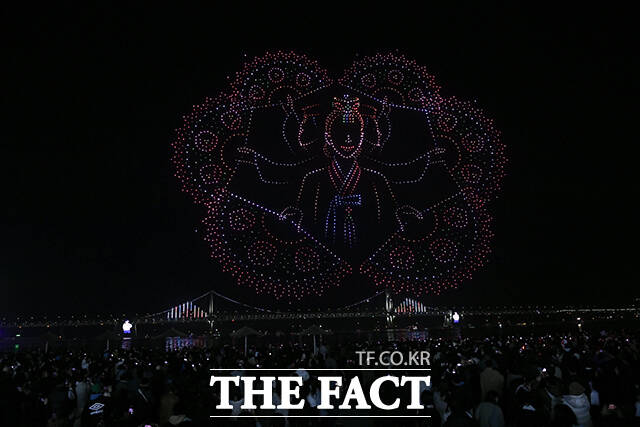 이날 공연은 '복이 깃드는 설날'을 주제로 2,500여 대의 드론이 동원됐다. 설날을 대표하는 복주머니와 붉은 말의 형상이 나오자 관람객들은 탄성을 내뱉었다.