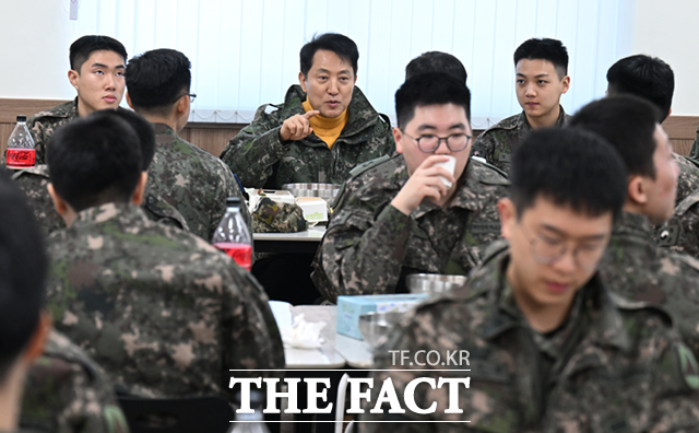 [더팩트ㅣ이새롬 기자] 오세훈 서울시장이 설을 하루 앞둔 16일 서울 1방공여단 방공진지를 방문해 장병들과 함께 오찬하며 격려하고 있다.