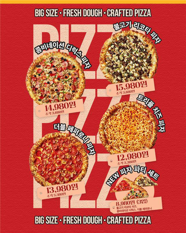 이와 함께 불고기와 리코타 치즈를 강조한 '불고기 리코타 피자(1만5980원)', 두 가지 페퍼로니를 적용한 '더블 페퍼로니 피자(1만3980원)', 모짜렐라, 체다, 고다 치즈를 조합해 풍미를 높인 '트리플 치즈 피자(1만2980원)' 등도 1만원대 가격으로 즐길 수 있는 가족 먹거리로 자리를 잡았다.