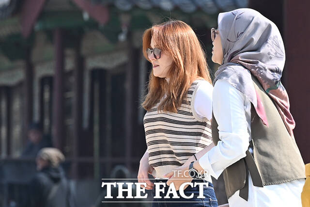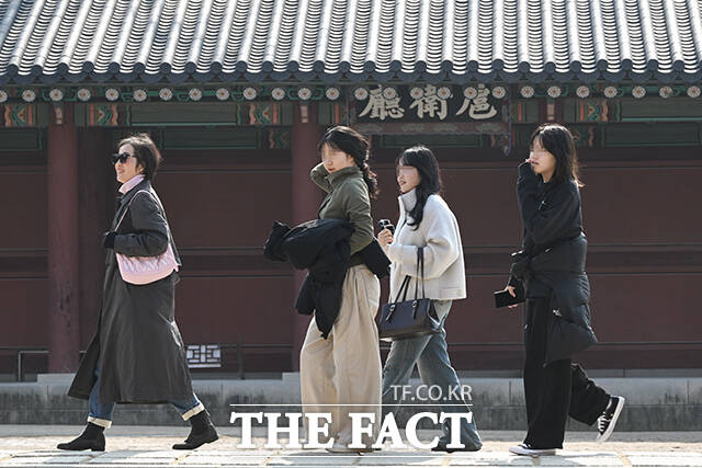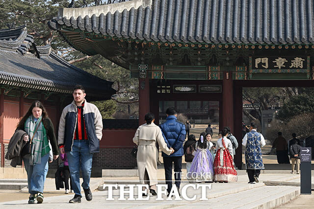 [더팩트 | 김성렬 인턴기자] 서울 낮 최고기온이 13도를 기록하며 포근한 날씨를 보인 20일 오후 서울 종로구 창덕궁을 찾은 관광객들이 가벼운 옷차림으로 궁을 둘러보고 있다.