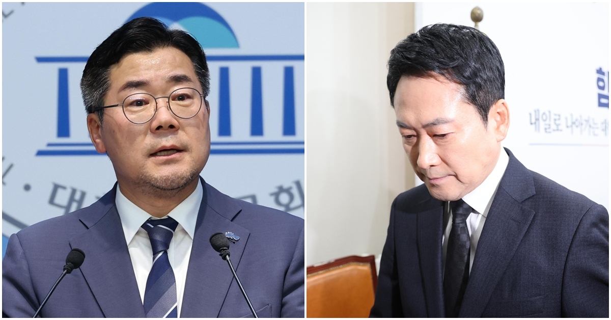 [더팩트ㅣ인천=남윤호 기자] 윤관석 전 더불어민주당 의원(가운데)이 20일 오후 인천 남동구 더불어민주당 인천광역시당에서 복당신청서를 제출한 후 소회를 밝히고 있다. 오른쪽은 같은 날 복당을 신청한 송영길 전 민주당 대표.