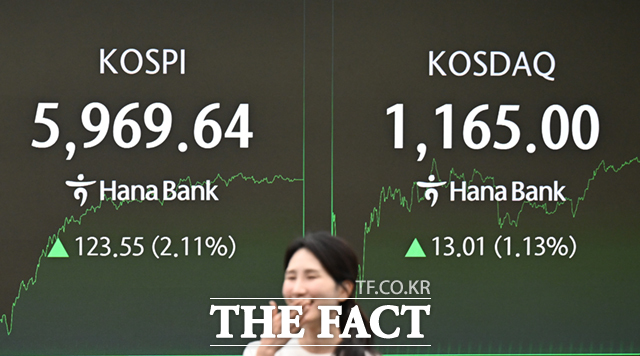 이날 코스피는 전일 대비 123.55포인트(2.11%) 오른 5969.64로 거래를 마치며, 종가 기준 역대 최고치를 또 갈아치웠다.
