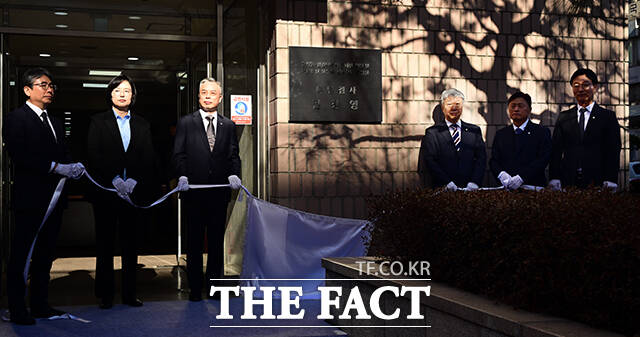 [더팩트ㅣ과천=임영무 기자] 3대 특검팀의 미진한 수사 및 새로운 의혹을 수사하는 2차 종합특검팀에 임명된 권창영 특검(왼쪽 세 번째)과 특검보들이 25일 오전 경기 과천에 마련된 특검 사무실 앞에서 현판식을 갖고 있다.darkroom@tf.co.kr사진영상기획부 photo@tf.co.kr