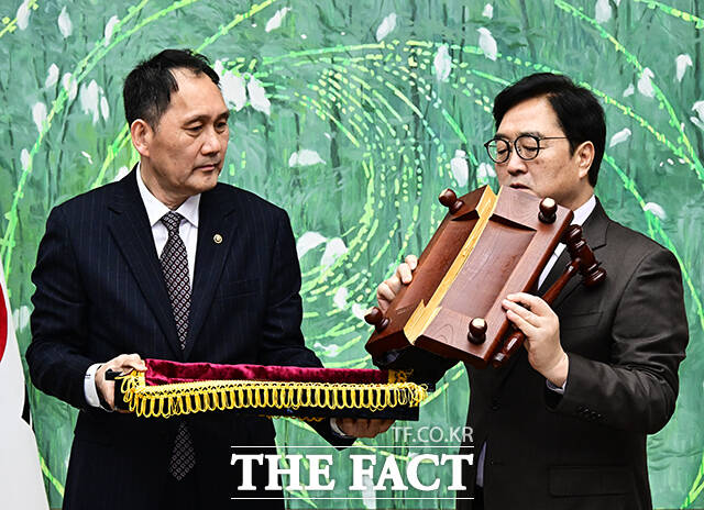 [더팩트ㅣ국회=배정한 기자] 우원식 국회의장(오른쪽)이 25일 오전 서울 여의도 국회에서 열린 ‘국회기록원 제1호 기록물 기증식’에 참석해 본회의장에서 사용하던 의사봉과 의사봉판을 기증하고 있다.