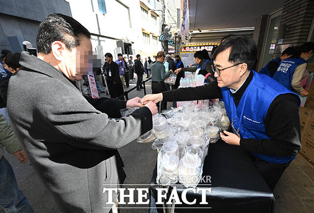 [더팩트ㅣ박헌우 기자] 임기근 기획재정부 제2차관(왼쪽)과 배우 박하선 등 행복공감봉사단 단원들이 25일 오전 서울 종로구 돈의동 쪽방촌에서 쪽방촌 어르신을 위한 정월대보름맞이 도시락을 배달하고 있다.