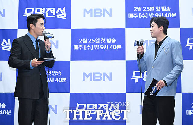 [더팩트ㅣ서예원 기자] 가수 장민호와 가수 남진, 조항조, 주현미, 신유, 강문경, 손태진, 방송인 양세형, 가수 임한별, 방송인 김대호(왼쪽부터)가 25일 오전 서울 마포구 상암 스탠포드호텔 코리아에서 열린 MBN 오디션 프로그램 ‘무명전설-트롯 사내들의 서열전쟁’ 제작발표회에 참석해 포즈를 취하고 있다.