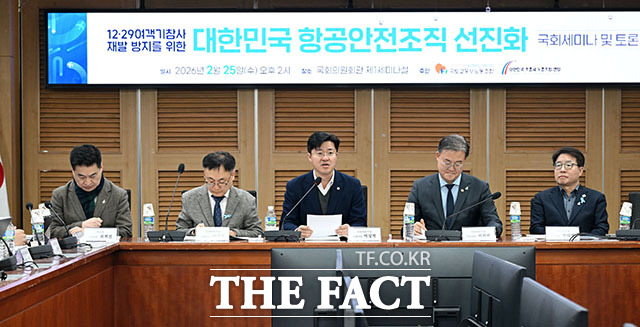 [더팩트ㅣ국회=남용희 기자] 장웅현 국토교통부 노동조합 위원장과 이광희, 박상혁 더불어민주당 의원, 최현 조종사노동조합연맹 위원장, 염태영 의원(앞줄 왼쪽부터) 및 참석자들이 25일 오후 서울 여의도 국회 의원회관에서 열린 12.29 여객기참사 재발 방지를 위한 대한민국 항공안전조직 선진화 토론회에서 기념촬영을 하고 있다.