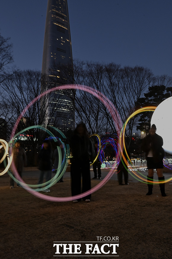 [더팩트 | 송호영 기자] 정월 대보름을 약 일주일 앞둔 25일 오후 서울 송파구 석촌호수 '더 스피어(The sphere)'에서 시민들이 LED 쥐불놀이를 돌리고 있다.