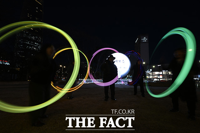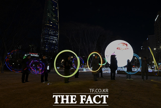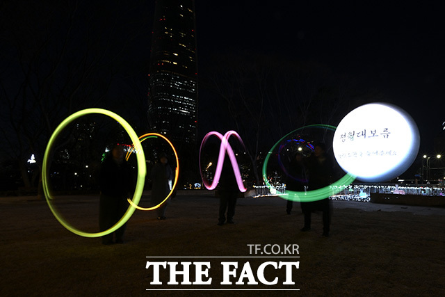 [더팩트 | 송호영 기자] 정월 대보름을 약 일주일 앞둔 25일 오후 서울 송파구 석촌호수 '더 스피어(The sphere)'에서 시민들이 LED 쥐불놀이를 돌리고 있다.