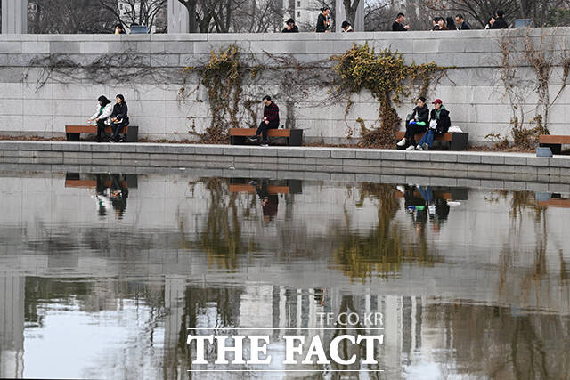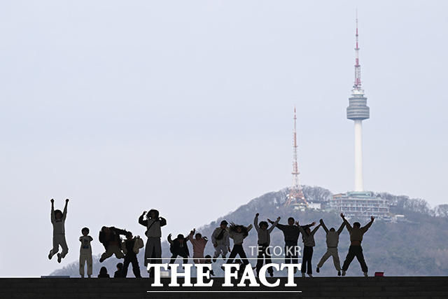 [더팩트 | 김성렬 기자] 포근한 날씨를 보인 26일 서울 용산구 국립중앙박물관을 찾은 시민들이 남산타워를 배경으로 기념촬영을 하고 있다.