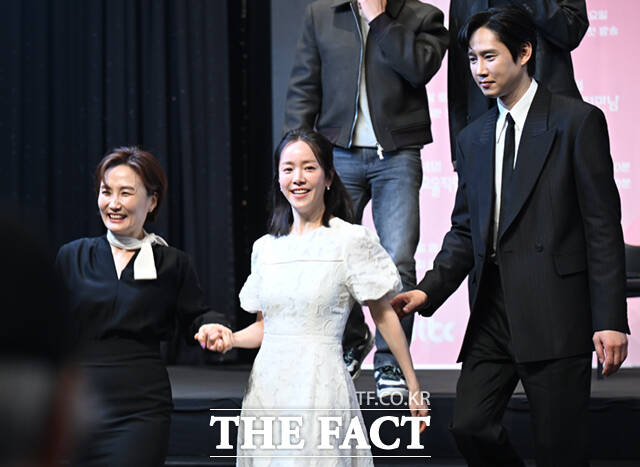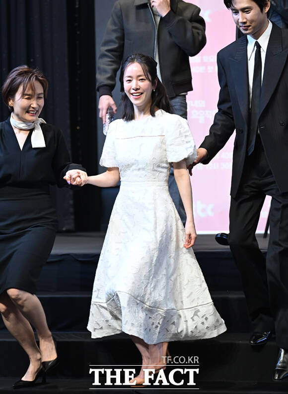 [더팩트ㅣ이새롬 기자] 배우 한지민이 26일 오후 서울 구로구 더 링크호텔 서울에서 열린 JTBC 새 토일드라마 '미혼남녀의 효율적 만남' 제작발표회에 참석해 박경림(왼쪽)과 박성훈의 에스코트를 받으며 퇴장하고 있다.