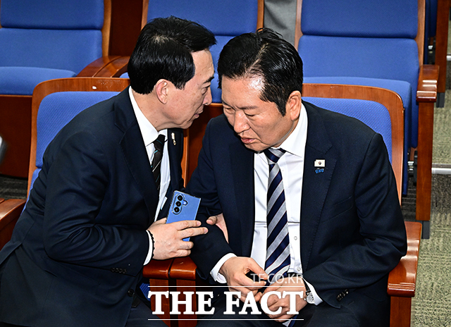 [더팩트 | 국회=배정한 기자] 정청래 더불어민주당 대표가 26일 오후 서울 여의도 국회에서 열린 의원총회에 참석해 박수현 수석대변인(왼쪽)과 대화를 하고 있다.hany@tf.co.kr사진영상기획부 photo@tf.co.kr