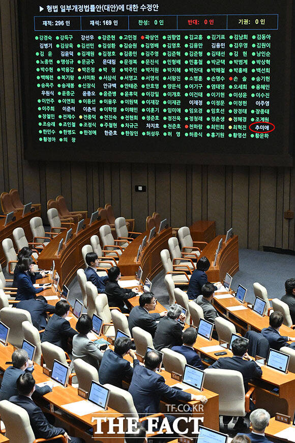 국회는 이날 본회의에서 법왜곡죄 수정안을 재적의원 170명 중 찬성 163명, 반대 3명, 기권 4명으로 통과시켰다.