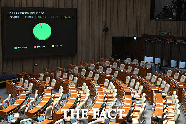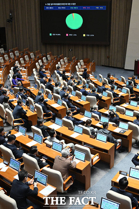 국회는 이날 본회의에서 법왜곡죄 수정안을 재적의원 170명 중 찬성 163명, 반대 3명, 기권 4명으로 통과시켰다.