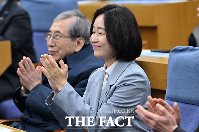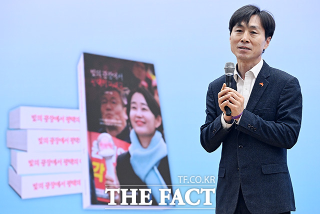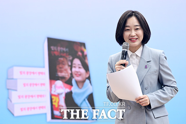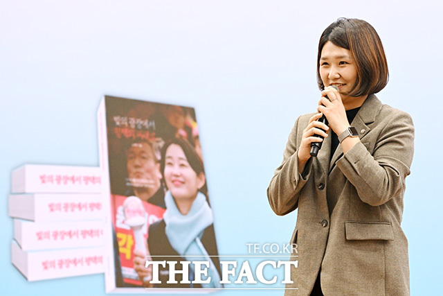 [더팩트ㅣ국회=남용희 기자] 김재연 진보당 상임대표가 3일 오후 서울 여의도 국회 의원회관에서 열린 '빛의 광장에서 평택의 미래로' 북콘서트에 참석해 손피켓을 들어보이며 기념촬영을 하고 있다.