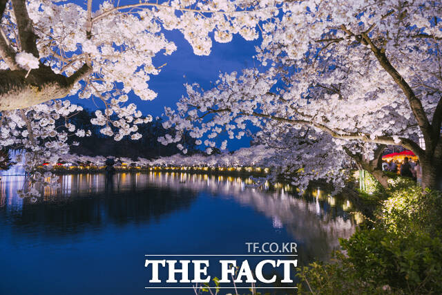 김천 연화지는 호수 수면 위로 벚꽃이 투영되는 아름다운 반영(反影)으로 유명하다.