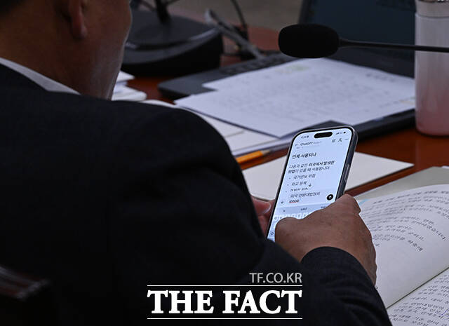 [더팩트ㅣ국회=박헌우 기자] 박성민 산자위 야당 간사가 9일 오후 서울 여의도 국회에서 열린 산업통상자원중소벤처기업위원회 전체회의에 참석해 챗GPT를 사용하고 있다.