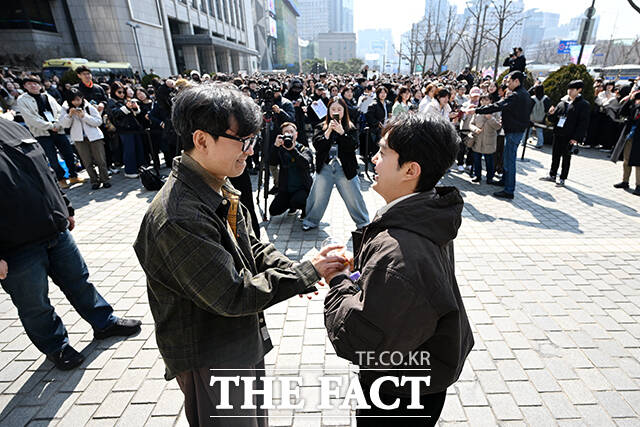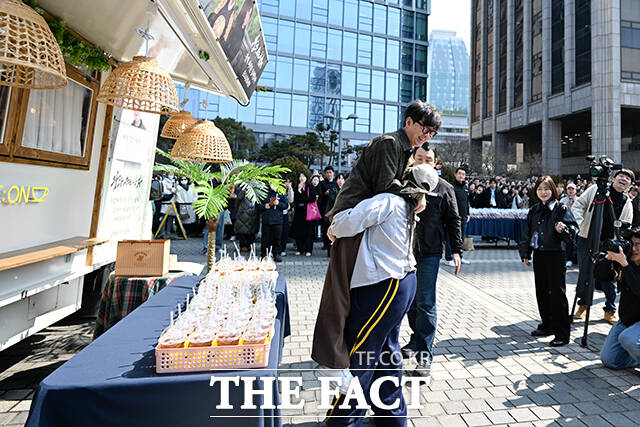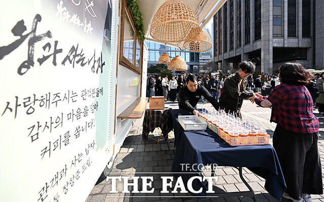 [더팩트ㅣ서예원 기자] 영화 ‘왕과 사는 남자’가 누적 관객수 1200만 명을 돌파한 12일 오후 서울 중구 서울신문사 광장에서 장항준 감독(오른쪽)이 시민들에게 커피를 나눠주며 감사 인사를 전하고 있다.
