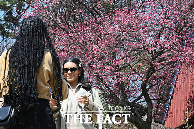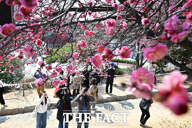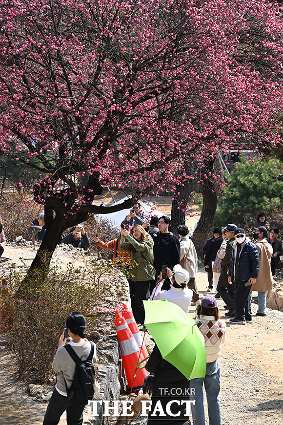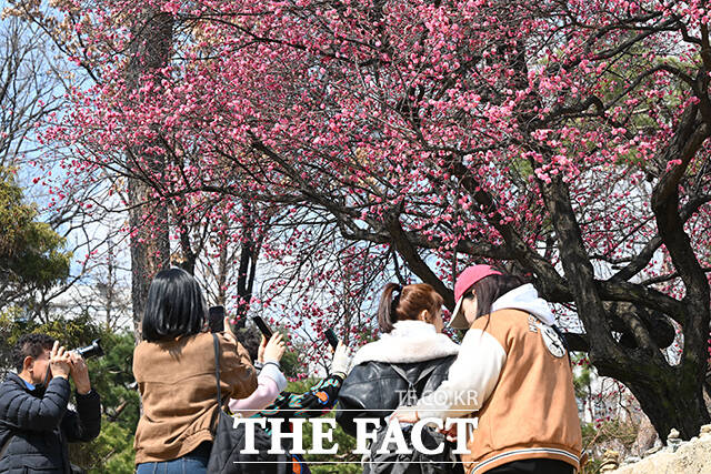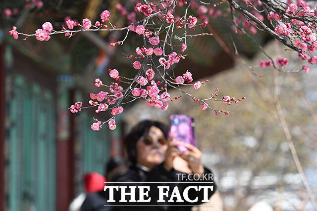 [더팩트 | 김성렬 기자] 낮 최고기온이 12도를 기록하며 포근한 날씨를 보인 12일 오후 서울 강남구 봉은사를 찾은 시민들이 활짝 핀 홍매화를 사진으로 담고 있다.