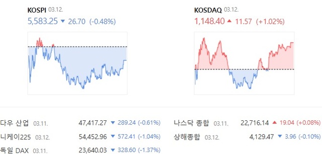 12일 한국거래소에 따르면 이날 코스피는 전 거래일 대비 0.48% 내린 5583.25에 장을 마감했다. 개장 후 하락 출발했다가 잠시 상승 전환하기도 했으나, 매도 물량이 연이어 발생하면서 약보합세로 전환했다.