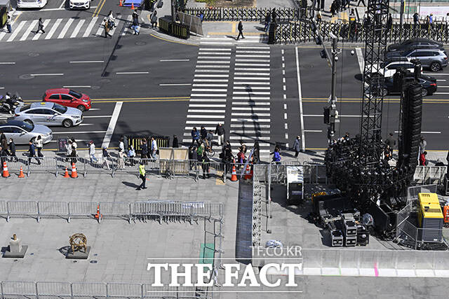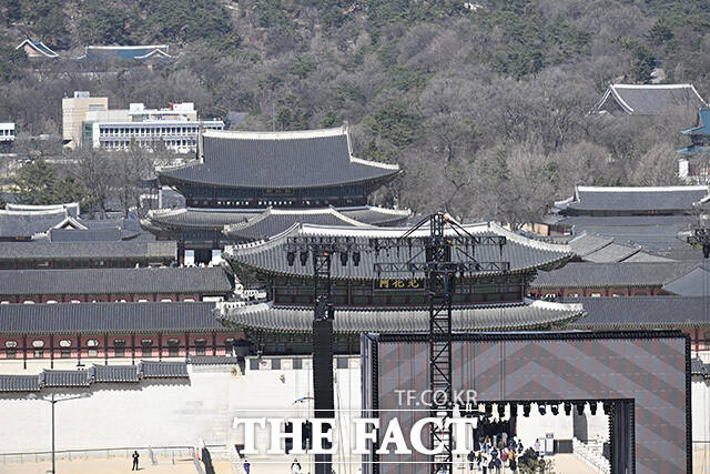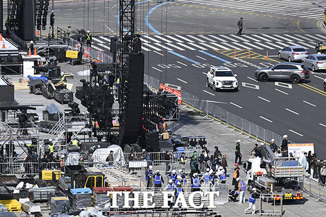 [더팩트 | 송호영 기자] 그룹 방탄소년단(BTS)의 컴백 공연을 이틀 앞둔 19일 오후 공연이 펼쳐질 서울 종로구 광화문광장에는 무대 및 관람객들의 공간이 준비되고 있다.