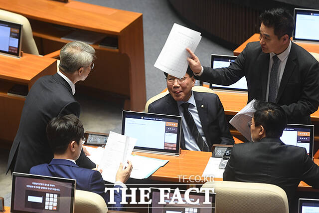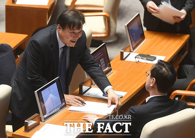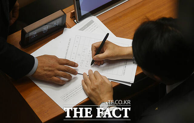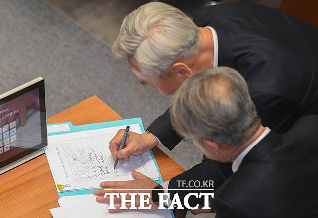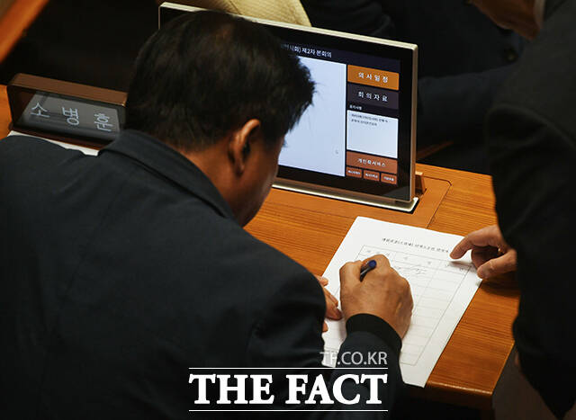 [더팩트 | 국회=박상민 기자] 조계원 더불어민주당 의원이 19일 오후 서울 여의도 국회에서 본회의가 시작되기 전 여당 의원들에게 조희대 대법원장 탄핵소추안 발의자 서명을 받고 있다.