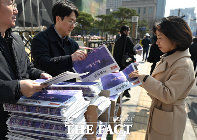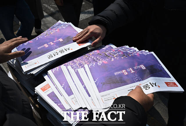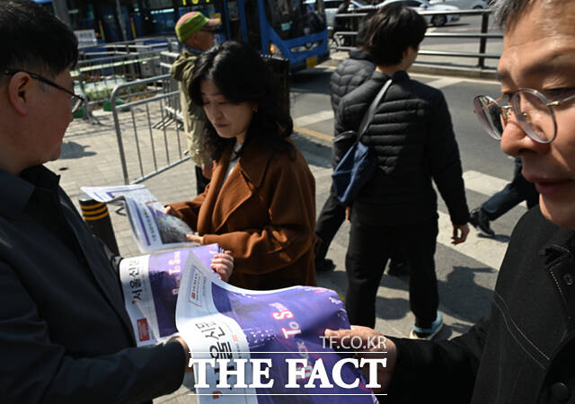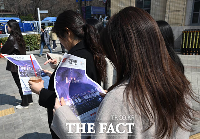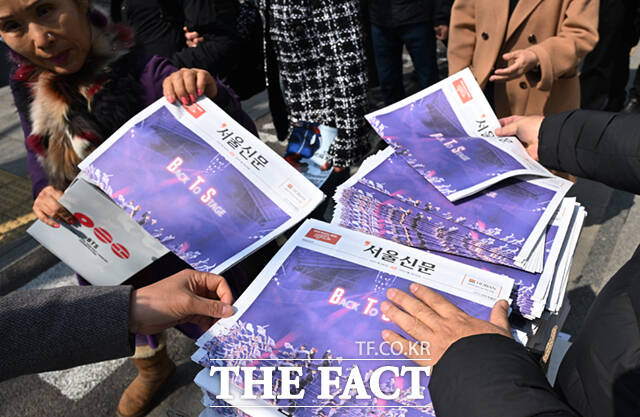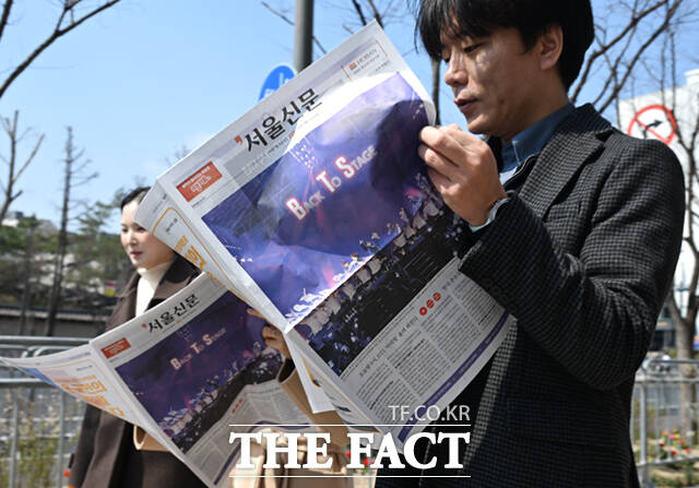 [더팩트ㅣ이새롬 기자] 방탄소년단(BTS)의 서울 광화문광장 공연 하루 전인 20일 오후 서울 광화문 일대에서 시민들이 한 신문사가 발행한 BTS 관련 호외를 살펴보고 있다.