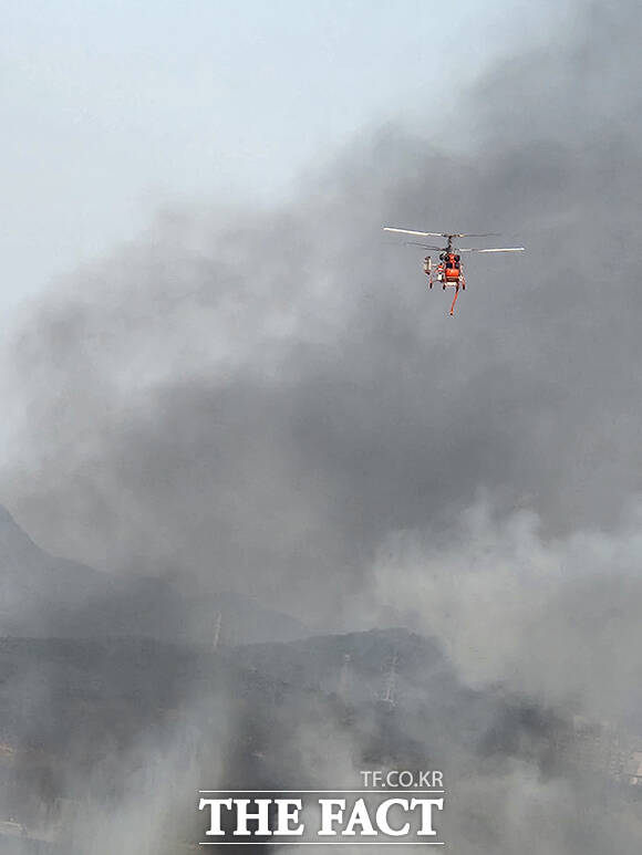[더팩트ㅣ남윤호 기자] 20일 오후 1시17분께 대전광역시 대덕구 문평동의 자동차 부품공장에서 화재가 발생해 소방헬기가 화재 진압을 하고 있다.