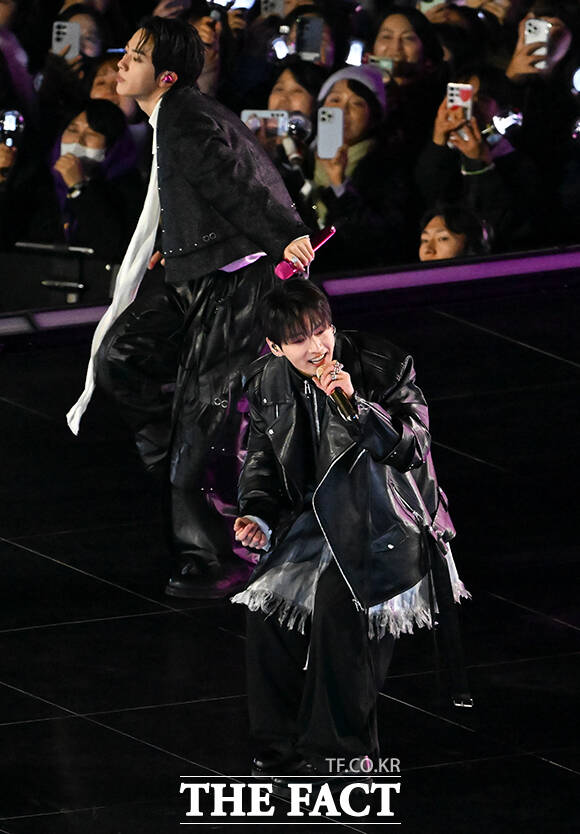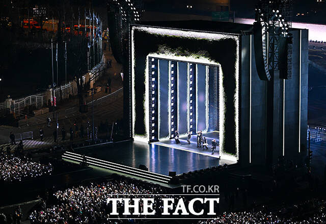[더팩트ㅣ배정한 기자] 그룹 방탄소년단(BTS)이 21일 오후 서울 광화문 광장에서 정규 5집 '아리랑(ARIRANG)' 앨범 발매를 기념해 마련된 컴백 무대에 올라 화려만 퍼포먼스를 선보이고 있다.