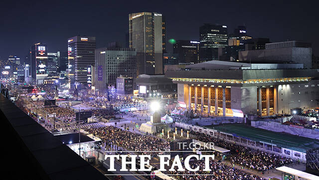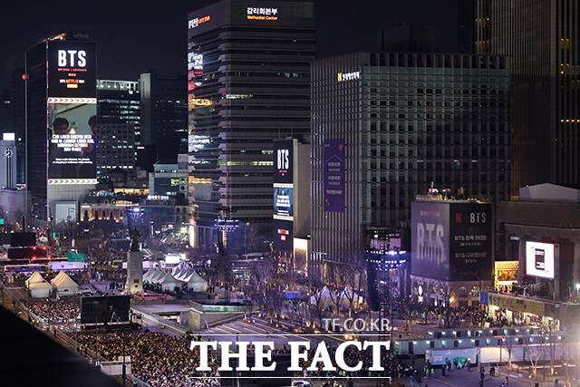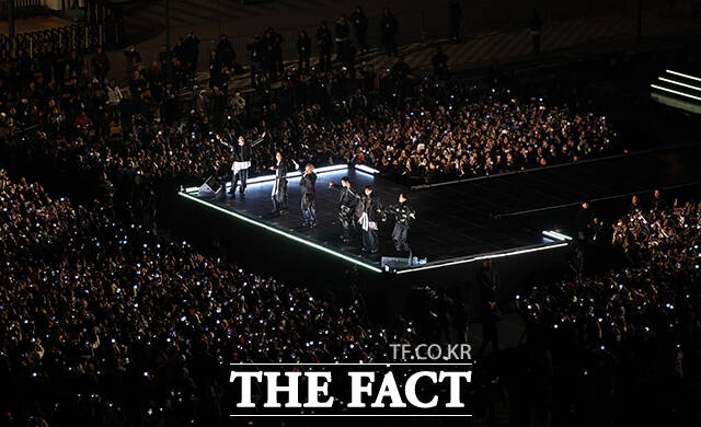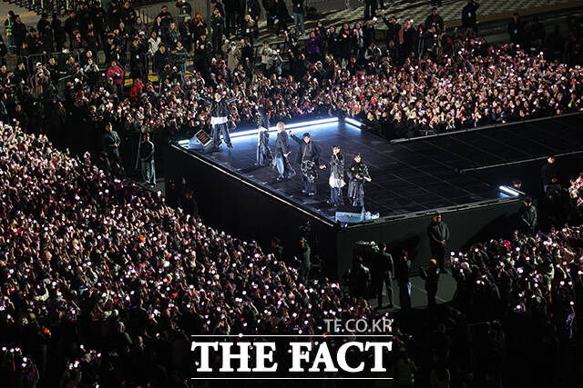 [더팩트ㅣ배정한 기자] 그룹 방탄소년단(BTS)이 21일 오후 서울 광화문 광장에서 정규 5집 '아리랑(ARIRANG)' 앨범 발매를 기념해 마련된 컴백 무대에 올라 화려한 퍼포먼스를 선보이고 있다.