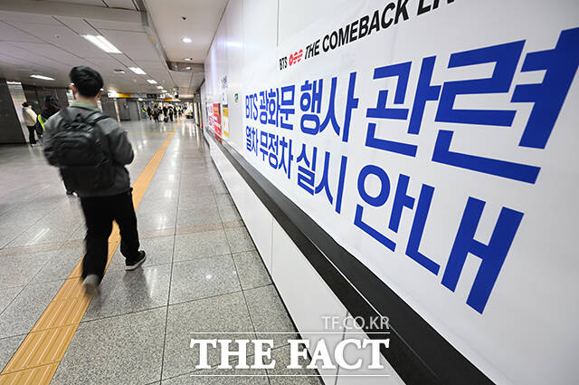 [더팩트ㅣ박헌우 기자] 그룹 방탄소년단(BTS)의 컴백 라이브를 앞둔 21일 오후 서울 종로구 광화문 일대 지하철역에 열차 무정차를 알리는 현수막이 붙어 있다.