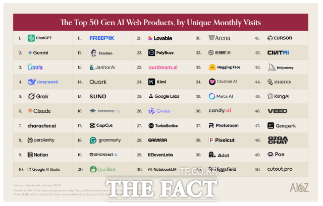 2위를 차지한 제미나이(Gemini) 보다 웹 트래픽에서 월 2.7배, 모바일 트래픽에서 월 2.5배 사용자가 많았다.