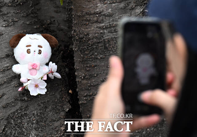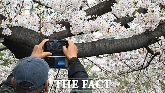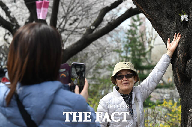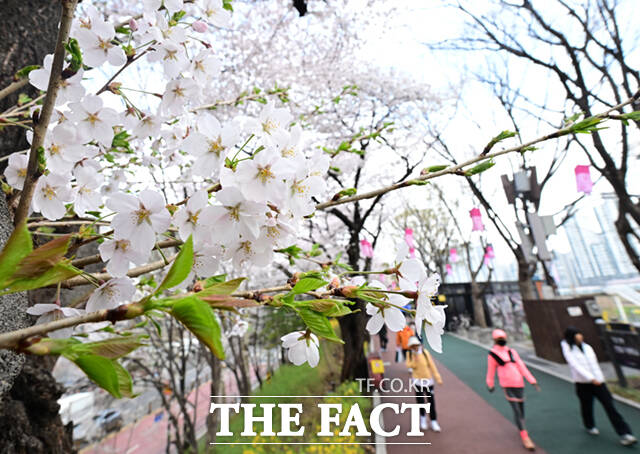 [더팩트ㅣ이새롬 기자] 새벽 봄비가 그치고 온화한 봄 날씨를 보인 31일 서울 동대문구 벚꽃길을 찾은 시민들이 벚꽃길을 걷고 있다.
