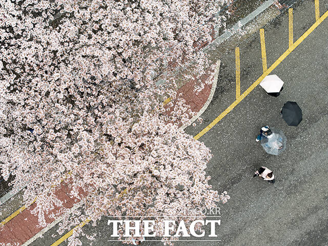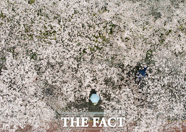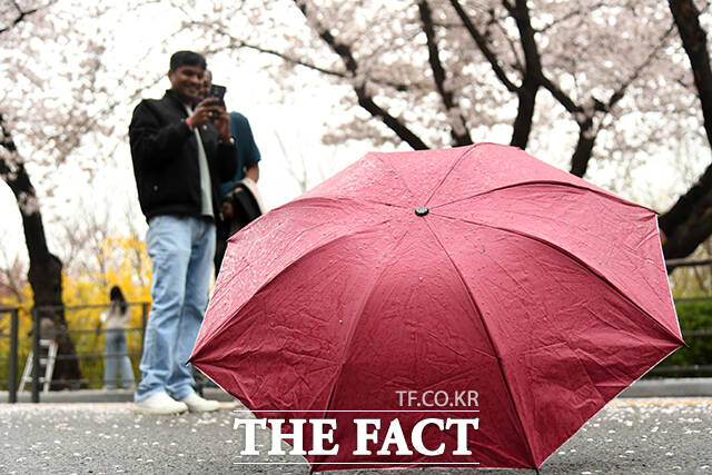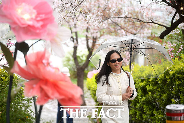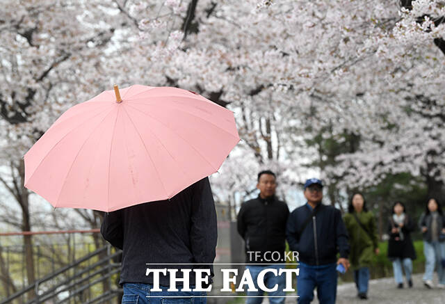[더팩트 | 박상민 기자] 봄비가 내리는 6일 오전 우산을 쓴 한 시민이 벗꽃 축제가 진행중인 서울 여의도 윤중로를 찾아 벚나무 사이를 지나고 있다