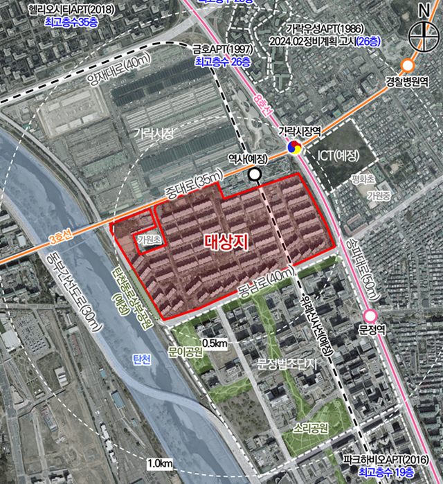 1988년 준공된 이 단지는 현재 4494세대 규모다. 지하철 가락시장역·문정역과 가깝고 송파대로·중대로·동남로와 접하고 있어 대중교통 접근성이 뛰어나다.