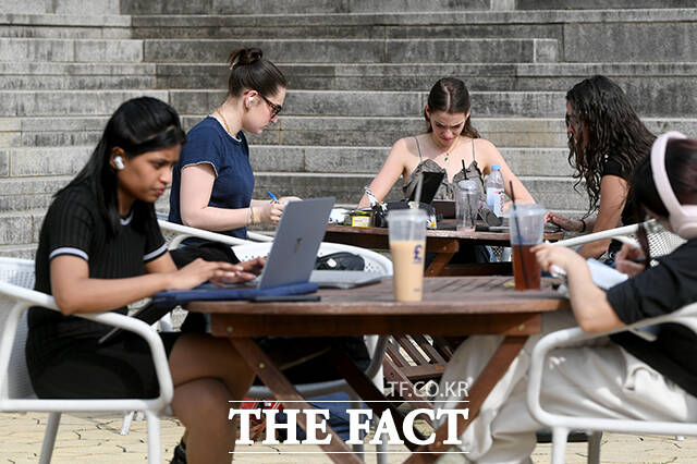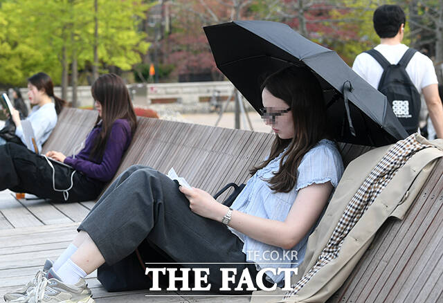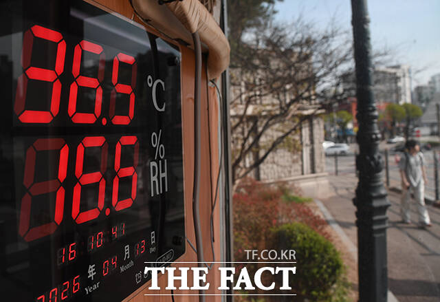 [더팩트 | 박상민 기자] 낮 기온이 27.3도까지 오른 13일 오후 서울 성북구 고려대학교 외벽 온도계가 36.5도를 표시하고 있다.