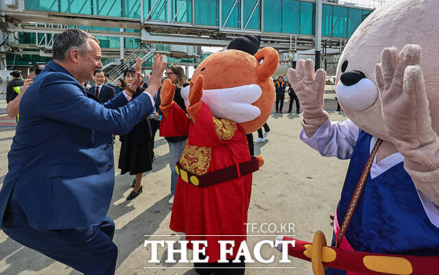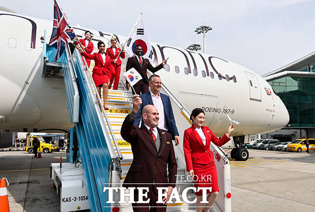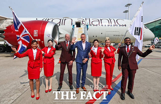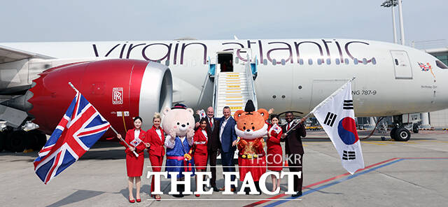 [더팩트ㅣ남윤호 기자] 14일 오전 인천국제공항 제2여객터미널주기장에 도착한 영국 버진애틀랜틱의 런던 히드로발 항공기 앞에서 관계자와 승무원들이 인천~런던 취항을 알리며 기념사진을 찍고 있다. 왼쪽 세 번째 부터 버진애틀랜틱 쉐인 로즈 기장, 한국관광공사 양경수 국제관광본부장, 버진애틀랜틱 코닐 코스터 최고경영자, 인천국제공항공사 김범호 사장직무대행.