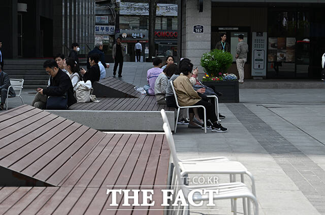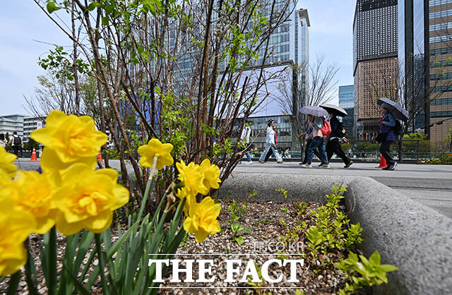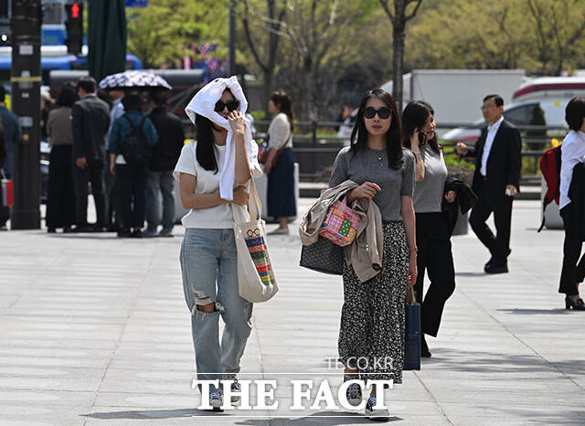 [더팩트ㅣ박헌우 기자] 서울의 낮 최고기온이 27도까지 오르는 등 초여름 날씨를 보인 14일 오후 서울 종로구 광화문 광장을 찾은 시민들이 양산을 쓰고 걸음을 옮기고 있다.